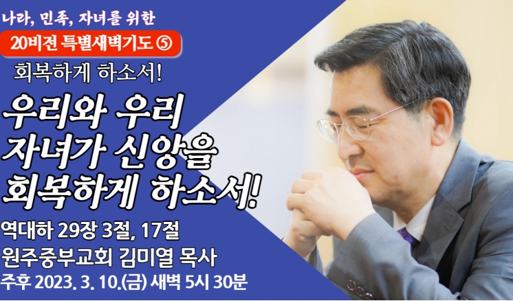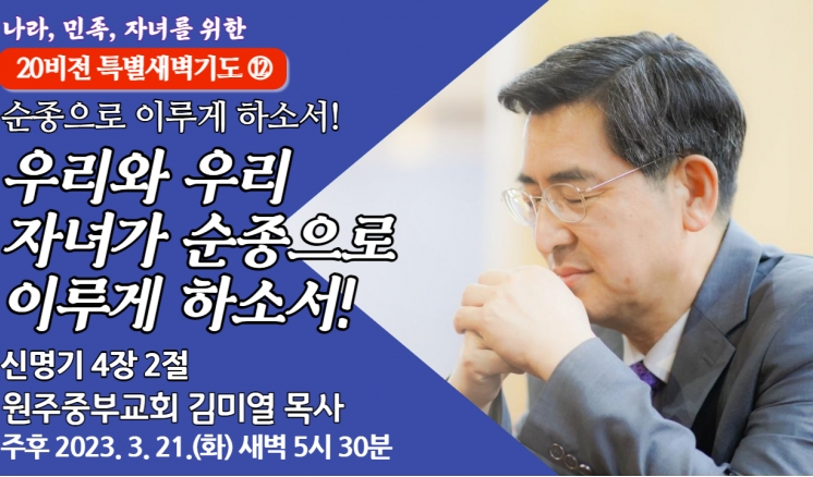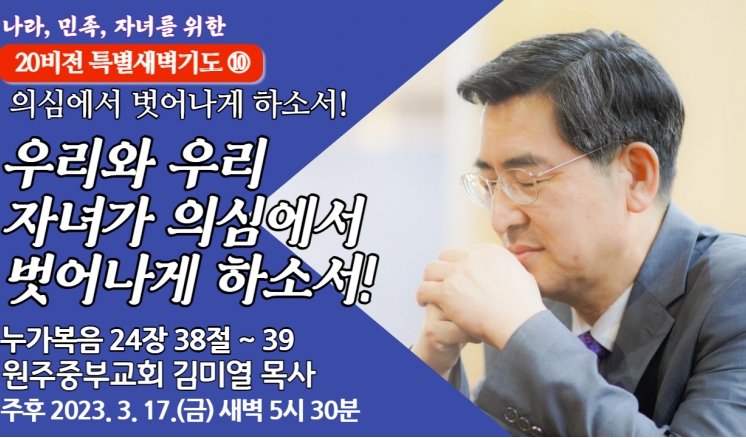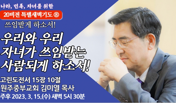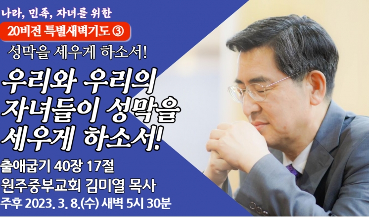 예배/말씀 - 주일예배 - 수요예배 - 특별예배 - QT 매일만나 - 특별새벽기도 - 말씀과기도축제 - 초빙강사 - CTS - 오디오설교(MP3) - 이전설교(18-21) 전체 20비전 고난주간 송구영신 분류 20비전 고난주간 송구영신 우리와 우리 자녀가 소망으로 이루게 하소서! 20비전 2023,03,22 우리와 우리 자녀가 순종으로 이루게 하소서! 20비전 2023,03,21 우리와 우리 자녀가 감사로 이루게 하소서! 20비전 2023,03,20 우리와 우리 자녀가 의심에서 벗어나게 하소서! 20비전 2023,03,17 우리와 우리 자녀가 감동하는 사람이 되게 하소서! 20비전 2023,03,16 우리와 우리 자녀가 쓰임받는 사람되게 하소서! 20비전 2023,03,15 우리와 우리 자녀가 힘있게 하소서! 20비전 2023,03,14 우리와 우리 자녀가 크게 하여 주소서! 20비전 2023,03,13 우리와 우리 자녀가 신앙을 회복하게 하소서! 20비전 2023,03,10 우리와 우리 자녀가 바벨론을 떠나게 하소서! 20비전 2023,03,09 우리와 우리의 자녀들이 성막을 세우게 하소서! 20비전 2023,03,08 우리와 우리 자녀가 문을 열게 하소서! 20비전 2023,03,07 목록 제목+내용제목내용댓글이름닉네임아이디등록일태그 3 4 5 6 7 8 9 10 11 12 예배/말씀 주일예배 수요예배 특별예배 QT 매일만나 특별새벽기도 말씀과기도축제 초빙강사 CTS 오디오설교(MP3) 이전설교(18-21)
