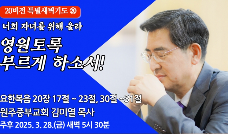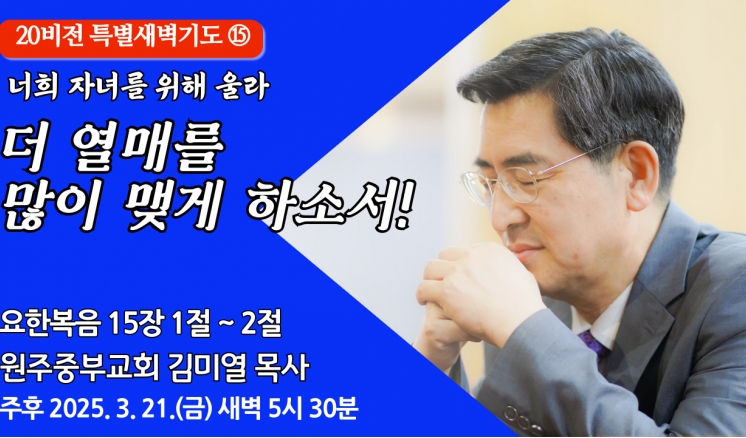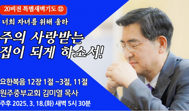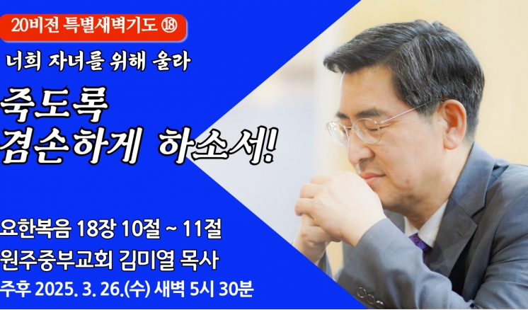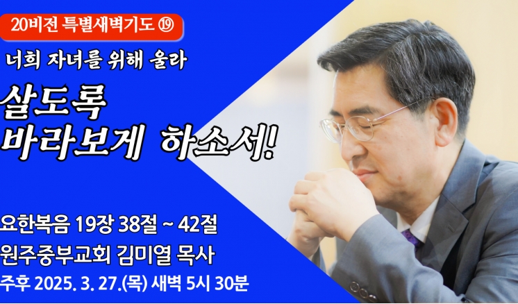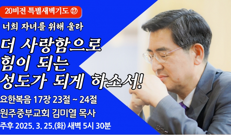 예배/말씀 - 주일예배 - 수요예배 - 특별예배 - QT 매일만나 - 특별새벽기도 - 말씀과기도축제 - 초빙강사 - CTS - 오디오설교(MP3) - 이전설교(18-21) 전체 20비전 고난주간 송구영신 분류 20비전 고난주간 송구영신 영원토록 부르게 하소서! 20비전 2025,03,28 살도록 바라보게 하소서! 20비전 2025,03,27 죽도록 겸손하게 하소서! 20비전 2025,03,26 더 사랑함으로 힘이 되는 성도가 되게 하소서! 20비전 2025,03,25 세상 속에서 예수의 용사로 살게 하소서! 20비전 2025,03,24 더 열매를 많이 맺게 하소서! 20비전 2025,03,21 약속의 말씀 의지하여 일어나게 하소서! 20비전 2025,03,20 우리와 우리 자녀가 갈 길을 계속 가게 하소서! 20비전 2025,03,19 주의 사랑받는 집이 되게 하소서! 20비전 2025,03,18 우리 자녀가 구원의 은혜로 살게 하소서! 20비전 2025,03,17 주의 음성을 들으며 살게 하소서! 20비전 2025,03,14 주님 앞에서 단순하게 살게 하소서! 20비전 2025,03,13 목록 제목+내용제목내용댓글이름닉네임아이디등록일태그 1 2 3 4 5 6 7 8 9 10 예배/말씀 주일예배 수요예배 특별예배 QT 매일만나 특별새벽기도 말씀과기도축제 초빙강사 CTS 오디오설교(MP3) 이전설교(18-21)